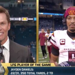 Tom Brady and Jayden Daniels (Photo via FOX Sports) Tom Brady and Jayden Daniels had a hilarious post-game conversation on live television following the Washington Commanders’ stunning 45-31 road win…
