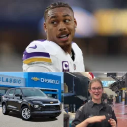 When kindness meets destiny… Maria Thompson, a janitor at U.S. Bank Stadium, helped Justin Jefferson fix a flat tire on a freezing Minnesota night. The next morning, a white SUV stopped in front of her house — and Jefferson stepped out with a smile: “You helped me when you didn’t have to… now let me help you.” Inside the car: a note that read, “From one Viking to another — you’ll never walk alone.” #Skol #VikingsFamily #JustinJefferson #FaithInHumanity #ActsOfKindness #MinnesotaHeart #OnceAVikingAlwaysAViking