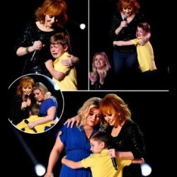 The arena went quiet. Music stopped. Lights dimmed. In the soft glow, Reba McEntire leaned down and whispered, “Remy, you’re up here with Granny.” Out came 8-year-old Remy—Kelly Clarkson’s son—tiny sneakers, big nerves. The song? Because of You. His mom’s song. His hands trembled. His voice, barely there. But Reba stood firm beside him. Slowly, his voice grew—shaky turned strong, whispers turned into truth. The crowd didn’t move. No phones. No noise. Just stillness. Backstage, Kelly cried. Her little boy wasn’t just singing—he was stepping into her world, one brave note at a time. When he finished, the silence broke. Cheers, claps, tears. But the real moment? It lived in that quiet space—where a mother saw her son become something more…