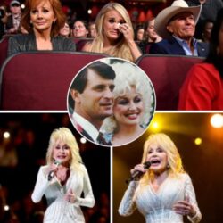 “Are you listening, love?” Dolly Parton’s voice quivered, her gaze lifting toward the heavens as if searching for the man who had been her anchor for more than fifty years. This wasn’t the glittering Dolly the world knew — no rhinestones, no dazzling smile, only a woman standing in the deepest shadow of loss. On the dimly lit stage, she sang not for fame, not for applause, but for the one who had always stood quietly behind her, now gone beyond reach. Her tribute unraveled like a love letter written in the language of grief, every note heavy with memories too sacred to speak. From the crowd, country royalty sat undone — Reba McEntire’s tears caught the light, Carrie Underwood pressed trembling fingers to her lips, and George Strait bowed his head, his shoulders rising with silent sobs. The room was frozen in holy stillness, as though the song itself had bridged earth and heaven for just a few minutes. And when the final chord faded, there was no cheer — only the soft sound of tears and the unspoken truth that Dolly hadn’t just sung to the crowd that night. She had sung to her husband… and maybe, just maybe, he heard her.