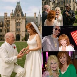 Guests gasped as Reba, 70, appeared at the top of the castle’s steps wearing a flowing, ivory lace gown adorned with subtle rhinestone details that shimmered in the late afternoon sun. Her signature red hair was swept back in soft waves beneath a delicate tiara — a nod to the setting’s fairy tale theme. Rex, striking in an all-white tuxedo with a single red rose pinned to his chest, couldn’t take his eyes off her. But just when guests thought the evening couldn’t get more enchanting, it did. During the reception — held on a starlit terrace overlooking the castle moat — the spotlight suddenly dimmed. A soft piano melody began to play, and out walked Reba’s fellow The Voice judges: Dolly Parton and Snoop Dogg. Gasps turned into goosebumps as the unexpected duo stepped onto the stage, surprising even the bride herself. With Dolly at the mic in a sparkling gown and Snoop beside her in an all-white tux, the two launched into a tender, country-soul version of “Can’t Help Falling in Love.” Dolly’s honeyed vocals intertwined with Snoop’s smooth, spoken-word verses in a way no one could have imagined — and just when the final chorus came, something happened that left even Reba herself in stunned, tearful silence.