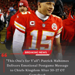 “This One’s for Y’all”: Patrick Mahomes Delivers Emotional Postgame Message to Chiefs Kingdom After 30-27 OT Comeback KANSAS CITY — The locker room was still vibrating. Champagne…