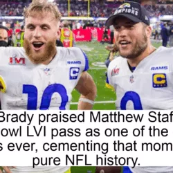 š„ Tom Brady just gave Matthew Stafford the ultimate respect ā and NFL fans are buzzing. š„ When the greatest quarterback of all time speaks, the football world listens. Tom Brady recently highlighted a Matthew Stafford throw from Super Bowl LVI, calling it āone of the greatest throws in the history of the NFL.ā The pass wasnāt just about arm strength or accuracy ā it was about timing, courage, and trust in the biggest moment imaginable. With pressure closing in and a championship on the line, Stafford delivered a throw that defined greatness. Coming from Brady, a seven-time Super Bowl champion, the praise hits different. Itās a reminder that legends recognize legends ā and that one single throw can live forever in NFL history. šš„